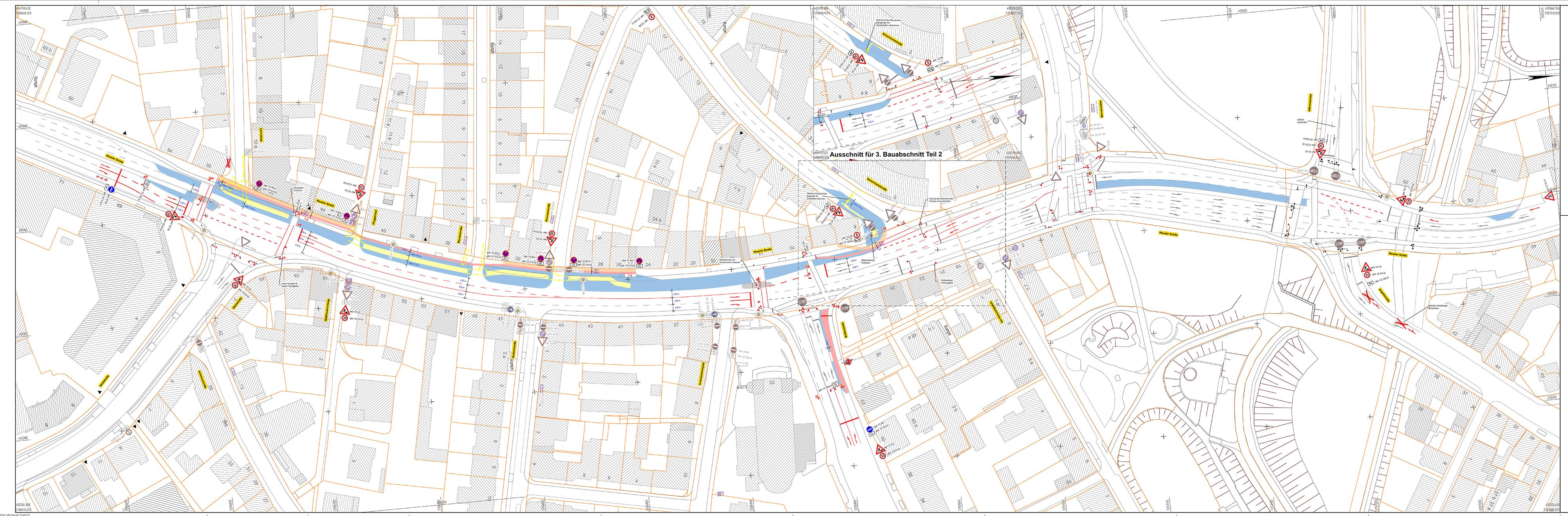 Den Bauplan für diesen Abschnitt finden Sie hier. In hellblau sind die abgesperrten Baufelder markiert, in dunkelblau Gräben für die Sanierung der Wasserleitung. Der Graben für die Fernwärmeverlegung ist gelb. Verschwenkte Rad- und Fußwege sind hellrot und orange dargestellt.