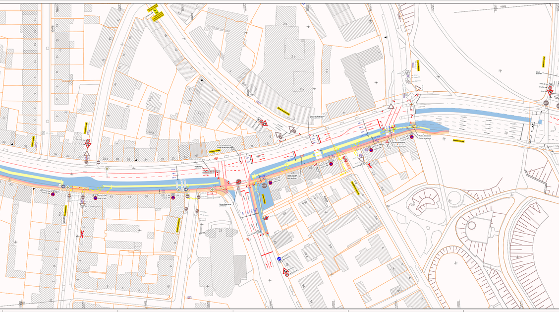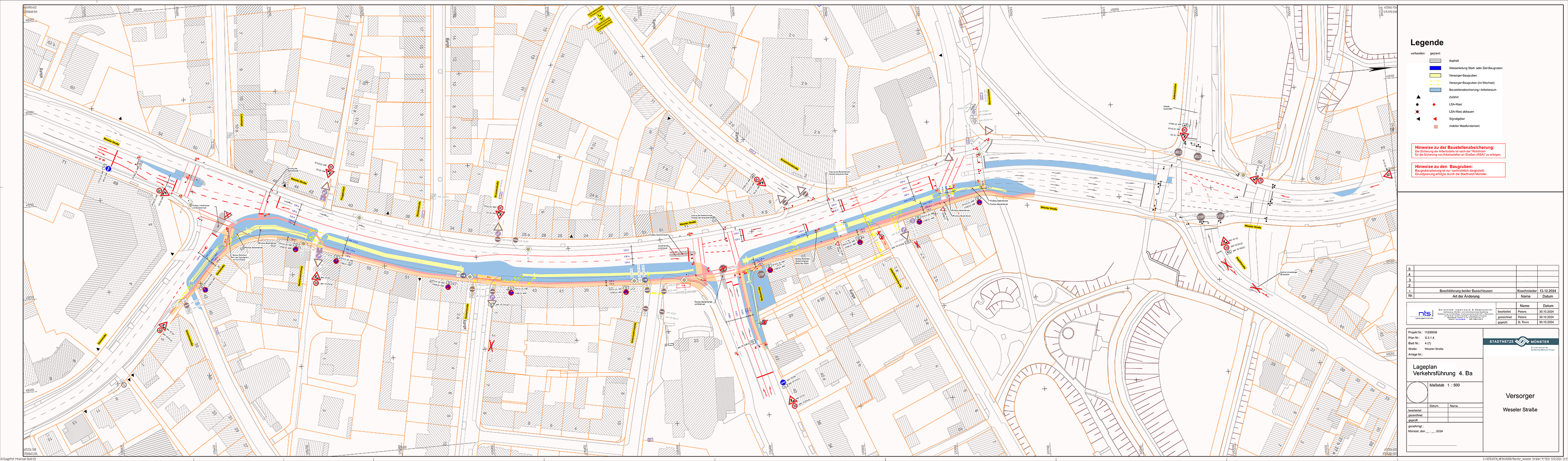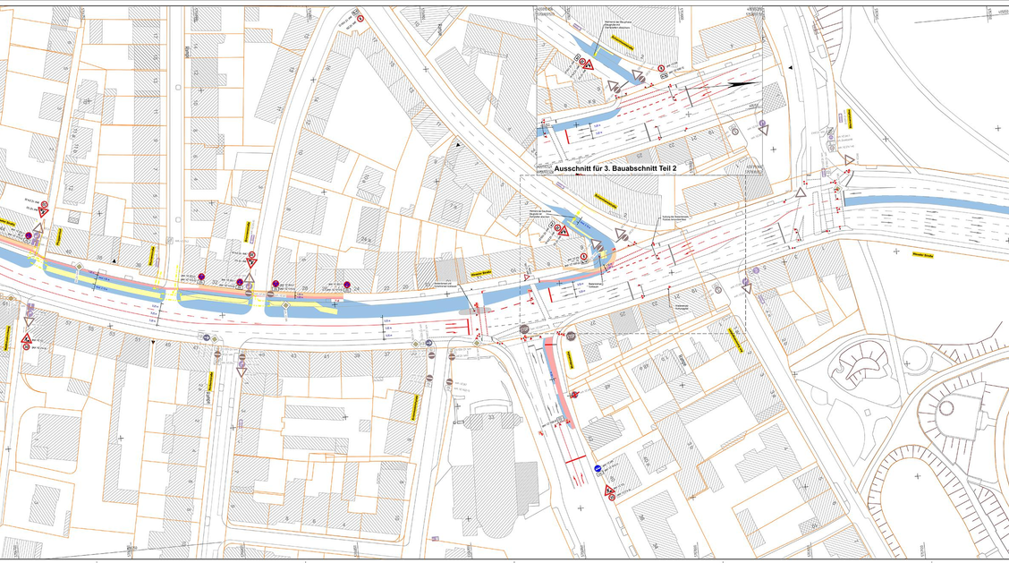 Den Bauplan für diesen Abschnitt finden Sie hier. In hellblau sind die abgesperrten Baufelder markiert, in hellgelb die Gräben für die Sanierung der Versorgungsleitungen. Verschwenkte Rad- und Fußwege sind hellrot und orange dargestellt.